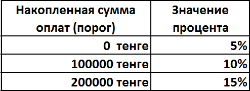 Когда накопленная сумма оплат перейдет порог 100 000 тг., то процент бонусов станет 10%.