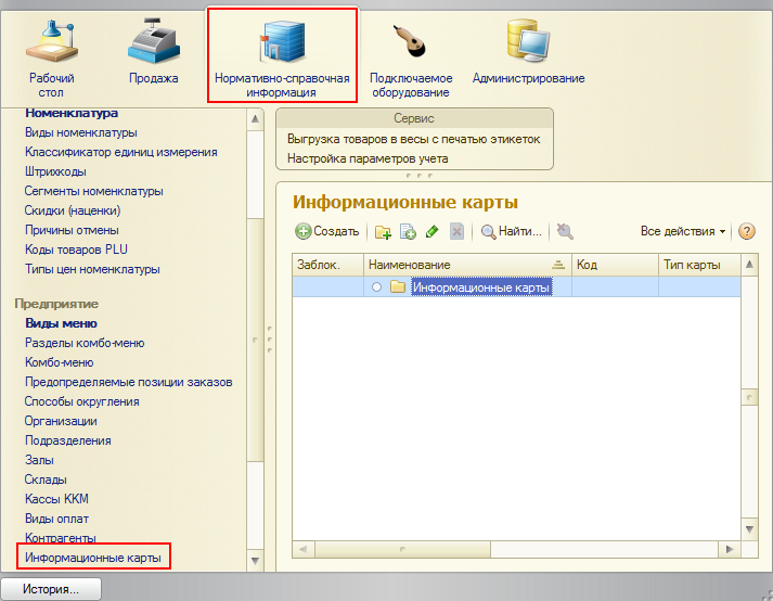 После создания бонусной карты необходимо настроить порядок накопления бонусов, согласно таблице приведенной в начале статьи. Для настройки порядка накопления бонусов, на закладке «Нормативно – справочная информация» панели навигации, переходим в регистр сведений «Параметры информационных карт».