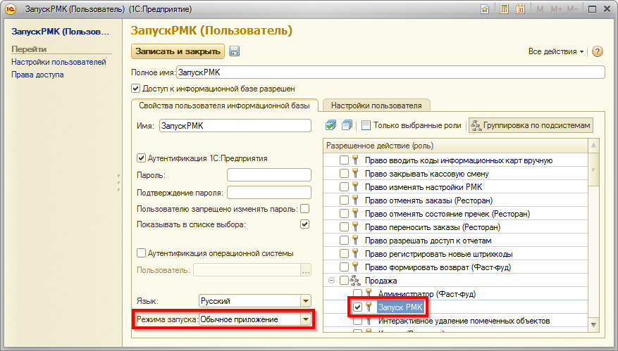 В качестве примера рассмотрим настройку запуска РМК для демонстрационной базы конфигурации «1С-Рейтинг: Ресторан». В данной демонстрационной базе присутствует пользователь «ЗапускРМК». Пользователю назначена роль «Запуск РМК» и указан режим запуска «Обычное приложение».