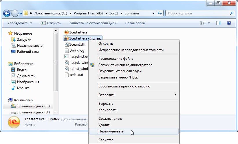 В результате выполнения этого действия в каталоге появится новый файл с именем «1cestart.exe - Ярлык».