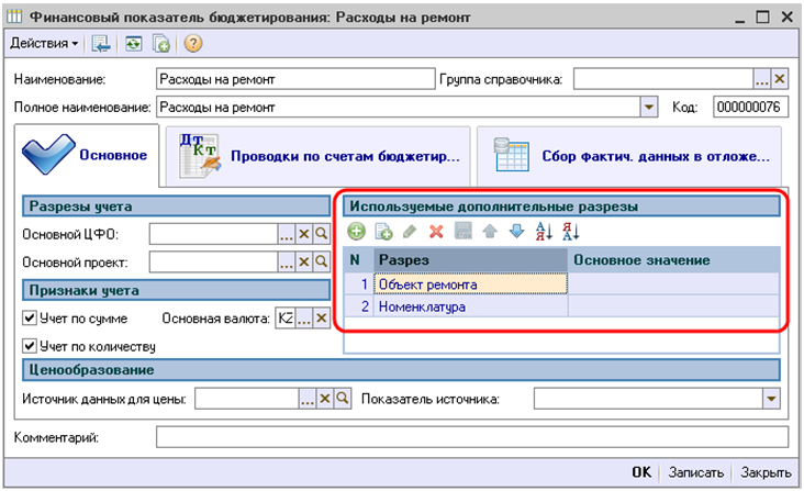 Создадим новый финансовый показатель «Расходы на ремонт» для планирования расходов на ремонт в рамках бюджета доходов и расходов, установим признаки учета «Учет по сумме» и «Учет по количеству», а также укажем основную валюту учета – тенге. В группе «Используемые дополнительные разрезы» добавим введенный ранее нами дополнительный разрез «Объект ремонта» и предопределенный разрез «Номенклатура».