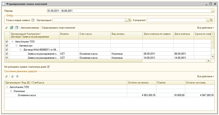Для создания плана платежей необходимо задать период, за который формируется план и, в случае необходимости, задать отбор: по организации и контрагенту. Если необходимо, чтобы при заполнении плана не учитывались частично исполненные заявки, то для этого необходимо установить признак «Только новые». При нажатии на кнопку «Автозаполнение», табличная часть будет заполнена заявками, дата расхода которых попадает в выбранный период.