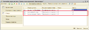 Настройка непосредственно прав доступа к отдельным элементам производится из справочника «Группы пользователей» при помощи обработки настройки прав доступа.