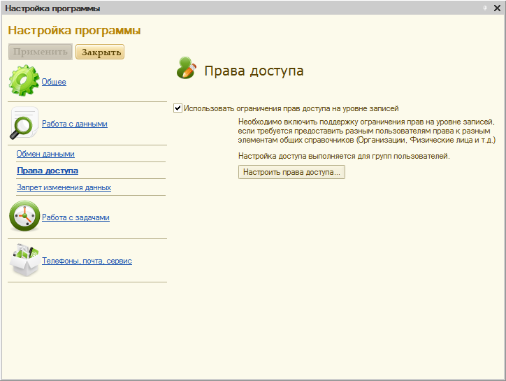 В открывшейся форме настройки в разделе «Работа с данными» укажем пункт «Права доступа», после чего устанавливаем признак Использовать ограничения прав доступа на уровне записей.