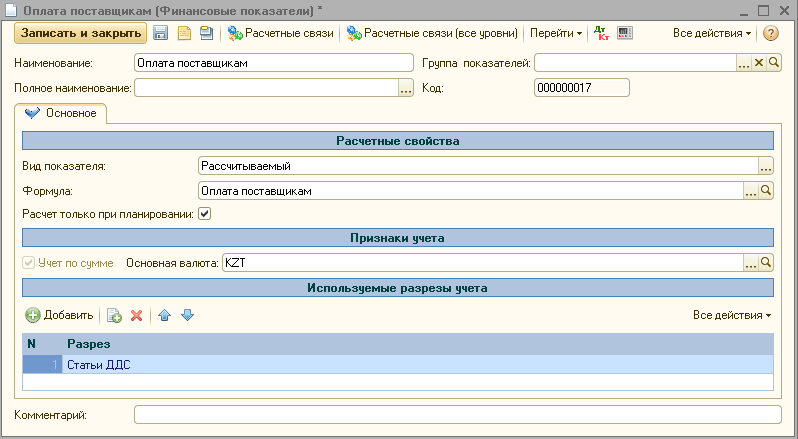 - Показатель – конкретный элемент справочника показателей (либо «Финансовые показатели», либо «Расчетные показатели» в зависимости от значения поля «Вид показателя»).