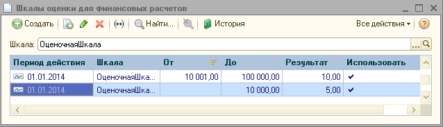 Интервалы и оценочные значения шкалы хранятся в регистре сведений «Шкалы оценки для финансовых расчетов». В нем добавляются записи, описывающие отдельные интервалы шкалы и их оценки. Каждая запись имеет свой период действия, а также признак использования. Например, если с какого-либо периода оценка интервала изменяется, необходимо создать новую запись, описывающую тот же интервал, но с другим результатом оценки. Если же изменяются сами интервалы, то необходимо сначала создать строки, описывающие старые интервалы и отключающие их использование, а уже затем – строки с новыми интервалами.