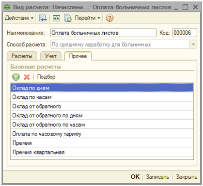 Для видов расчета, размер которых рассчитывается по среднему заработку, на закладке «Прочее» необходимо перечислить базовые виды расчета, то есть все виды начислений, которые входят в расчет среднего заработка. Например, для вида расчета «Оплата больничных листов» необходимо задать в качестве базовых такие виды начислений, как «Оклад по дням», «Оплата по часовому тарифу», «Премия» и т.д.