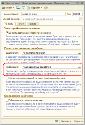 Для начислений, к которым необходимо применять повышающий коэффициент при расчете среднего заработка (согласно Единым правилам исчисления средней заработной платы) необходимо установить признак применения повышающего коэффициента в реквизите «Индексация». Если вид начисления отмечен как индексируемый, то при расчете среднего заработка к его сумме будет применяться повышающий коэффициент, в противном случае сумма по виду начисления всегда будет включаться в базу среднего заработка с коэффициентом, равным единице.
