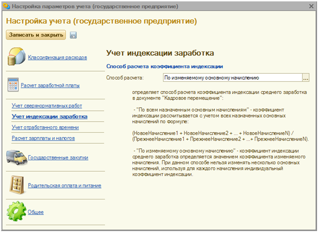 Способ расчета, который будет использоваться при ведении учета, указывается в меню «Предприятие» - «Настройка параметров учета (государственное предприятие)» на закладке «Расчет заработной платы» — «Учет индексации заработка».