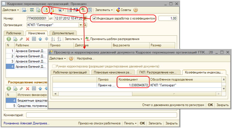 Непосредственно расчет коэффициента индексации заработка происходит при проведении документа «Кадровое перемещение организаций» с установленным в шапке документа признаком «Индексация заработка с коэффициентом». При этом на закладке «Начисления» документа «Кадровое перемещение организаций» для сотрудника должен быть указан новый размер изменяемого начисления.