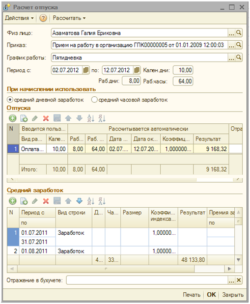 В открывшейся после выбора варианта расчета форме обработки «Расчет отпуска» или «Расчет больничного листа» указываются даты начала и окончания оплачиваемого периода, количество оплачиваемых дней, для отпуска — виды оплачиваемых отпусков в табличной части «Начисления», и при необходимости способ отражения начисленных сумм в бухгалтерском учете.