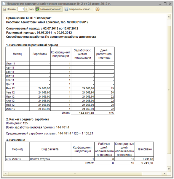 По результатам расчета можно получить печатную форму «Расчет среднего заработка», формируемую при нажатии на кнопку «Печать» на нижней панели формы обработки.