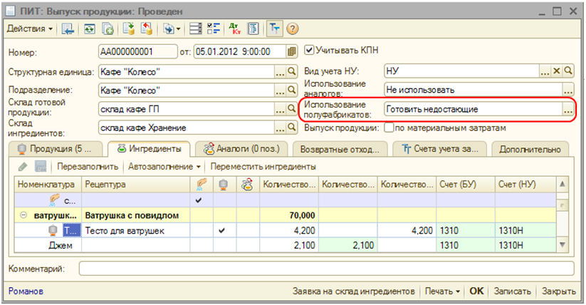 В табличной части «Продукция» вводится список продукции, подлежащей приготовлению, а на основании рецептур продукции формируется список ингредиентов, которые должны быть израсходованы на приготовление. При проведении документа списываются все ингредиенты с учетом вложенных рецептур (для ингредиентов — полуфабрикатов) и замены ингредиентов аналогами, а также приходуется готовая продукция, при этом выпуск приготовленных полуфабрикатов не регистрируется.