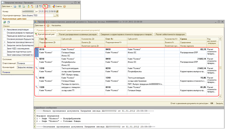 После выполнения всех вышеперечисленных действий, необходимо последовательно выполнить операции «Начисление амортизации» и «Расчет и корректировка себестоимости (услуг)» документа «Закрытие месяца» в конце отчетного периода.