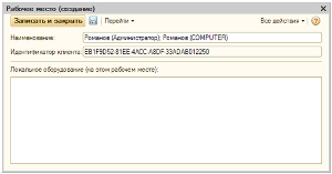 При создании для нового рабочего места автоматически генерируется наименование в соответствии с наименованием пользователя информационной базы и именем компьютера. Также автоматически будет сгенерирован идентификатор клиента. В поле «Локальное оборудование (на этом рабочем месте)» в дальнейшем будет отображаться перечень оборудования, подключенного к данному рабочему месту.