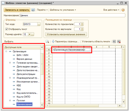 В поле табличного документа появится шаблон этикетки по умолчанию. В поле «Наименование» необходимо указать наименование шаблона этикетки. Для того, чтобы рассчитать количество этикеток заданного шаблона, которые должны поместиться на печатном листе по горизонтали и по вертикали, можно воспользоваться кнопкой «Установить максимальные значения», после этого можно сохранить созданный шаблон.