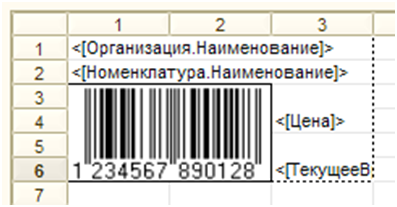 Теперь добавим штрих-код, выберем область, состоящую из двух ячеек по горизонтали, четырех по вертикали, добавим поле «Штрих-код» и соглашаемся с тем, что штрих-код будет добавлен картинкой.