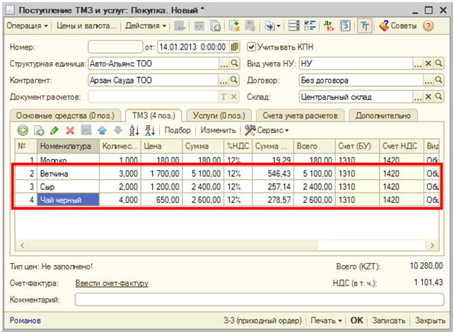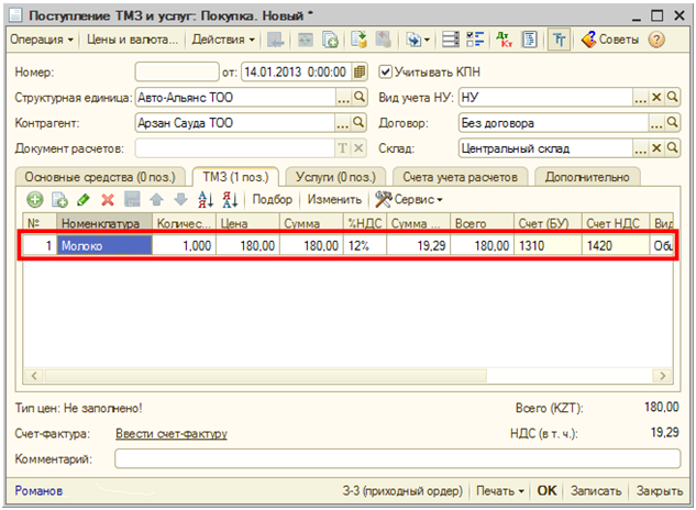 Так, в результате данных действий номенклатура «Молоко» добавится в табличную часть «ТМЗ» документа «Поступление ТМЗ и услуг», пользователю необходимо будет только ввести количество и цену.