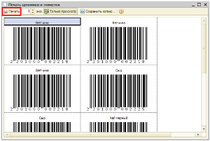Теперь необходимо распечатать этикетки со сгенерированными штрих-кодами. Строкам с номенклатурой, для которой были сгенерированы штрих-коды, необходимо установить признак «Печатать». В реквизите «Шаблон» шапки обработки необходимо выбрать созданный ранее шаблон «Этикетка» и нажать кнопку «Печать».
