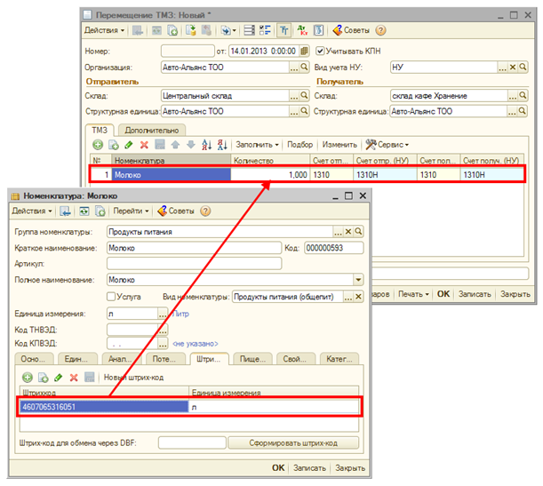 Рассмотрим использование сканера штрих-кодов в документе «Перемещение ТМЗ». Для этого будем перемещать ранее поступившую номенклатуру со склада «Центральный склад» на склад «склад кафе Хранение». Так как данные штрих-коды уже имеются в информационной базе, то соответствующая штрих-коду номенклатура будет автоматически добавляться в табличную часть документа при считывании сканером штрих-кодов перемещаемых товаров.