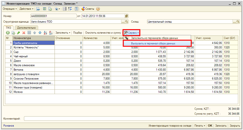 Затем выгружаем табличную часть «ТМЗ» в терминал сбора данных, для этого в командной панели необходимо выбрать «Сервис» — «Выгрузить в терминал сбора данных».