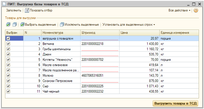 После заполнения сведений о штрих-кодах можно выгрузить данные о товарах в терминал сбора данных с помощью кнопки «Выгрузить товары в ТДС».