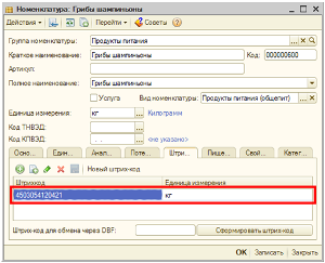Затем внести в табличную часть «Штрих-код» справочника «Номенклатура» соответствующий штрих-код.