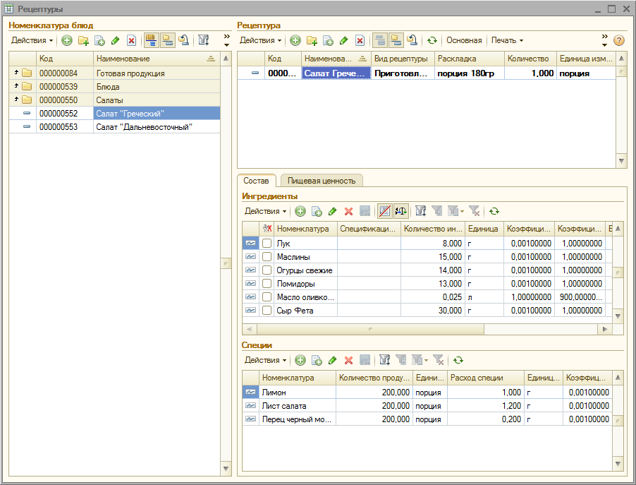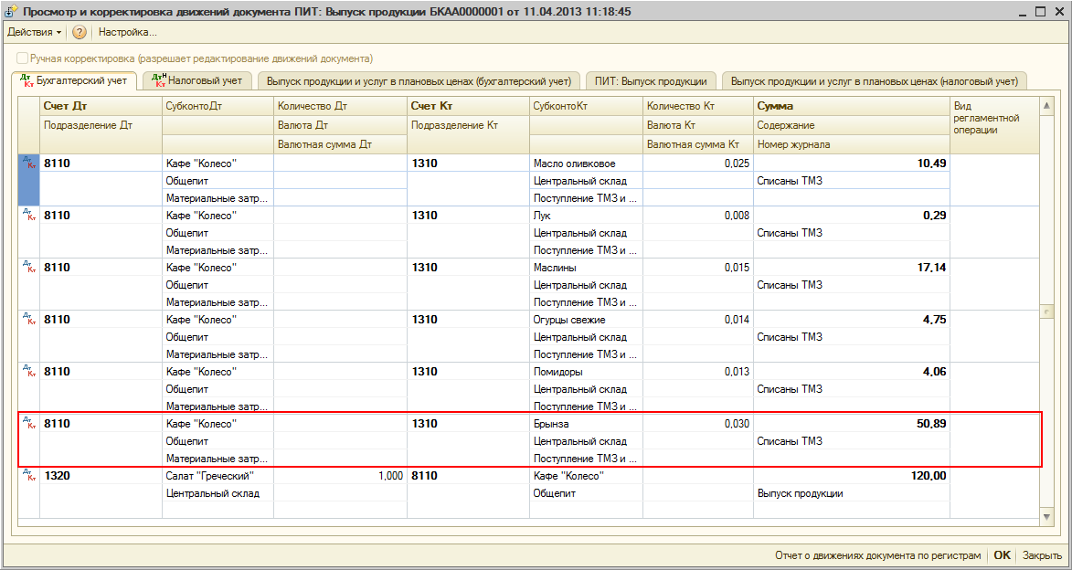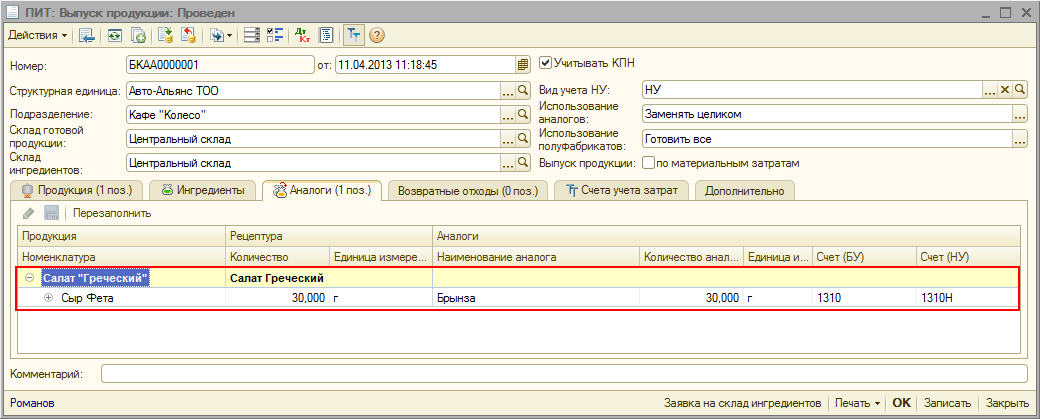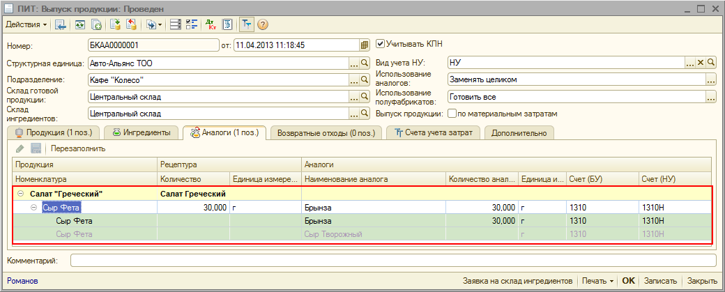 Здесь следует обратить внимание на то, что хотя в рецептуре приготовления блюда «Салат Греческий» указан ингредиент «Сыр Фета», документом списывается его аналог – ингредиент «Брынза».