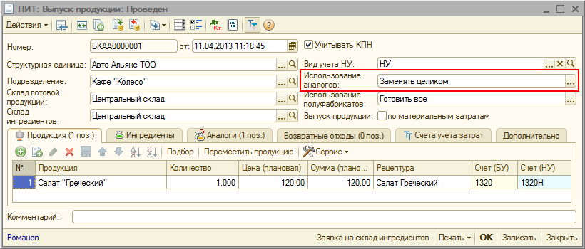 Заданные для номенклатуры аналоги будут использоваться в документе выпуска продукции для выполнения замены ингредиентов блюд.