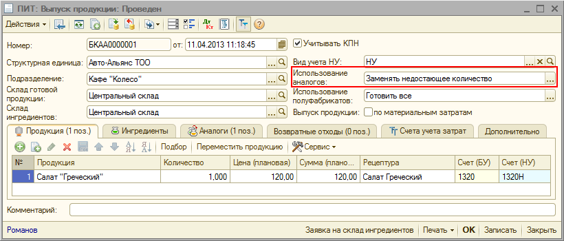 устанавливается признак, указывающий на то, что при выпуске продукции ингредиент будет заменен аналогом. В нашем случае на складе недостаточно ингредиента «Сыр Фета» и он будет заменен аналогом.