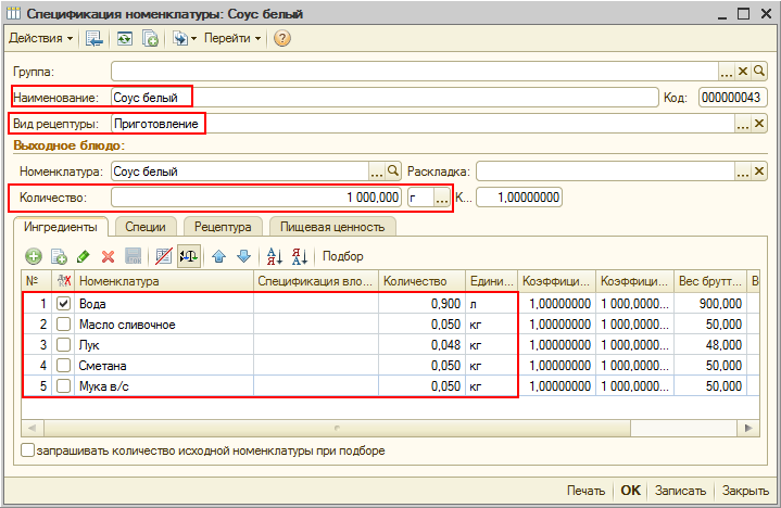 После того, как создали необходимые нам полуфабрикаты, продолжим создание рецептуры блюда «Лазанья». В табличную часть «Ингредиенты» вносим «Тесто пельменное» и «Соус белый». Кроме самих ингредиентов в табличной части в колонке «Спецификация вложенная» указываем созданные спецификации.