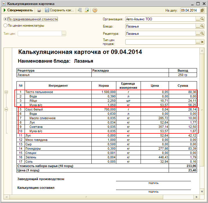 Нам необходимо создать рецептуру для блюда «Лазанья» на 10 порций, используя в рецептуре полуфабрикаты: тесто пельменное и белый соус. Кроме этого, необходимо сформировать технологическую и калькуляционную карточки.