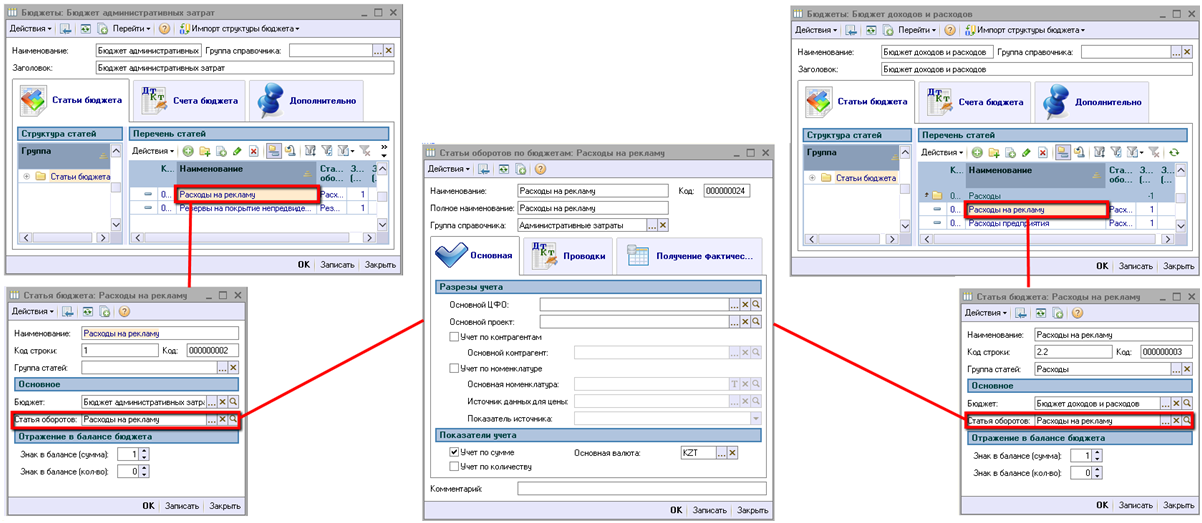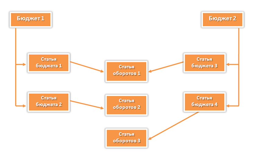Одна и та же статья оборотов может участвовать в статьях различных бюджетов, но не может быть назначена одновременно нескольким статьям одного и того же бюджета. Таким образом, статья бюджета является представлением статьи оборотов в конкретном бюджете. Можно сказать, что планирование и учет фактических данных построены на структуре статей оборотов, но группируются в бюджеты на основании привязок к их статьям.
