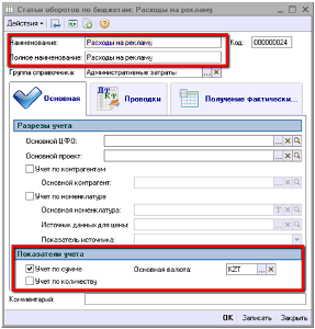Создадим перечень статей оборотов согласно приведенным выше таблицам. Для каждой статьи оборотов на закладке «Основная» укажем наименование и показатели учета. Для всех статей установим признак «Учет по сумме» и основную валюту «тенге». Признак «Учет по количеству» установим для статей бюджета продаж.