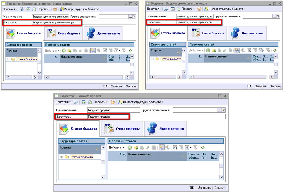Итак, после создания перечня статей оборотов по бюджетам, перейдем непосредственно к формированию структуры данных бюджетов.