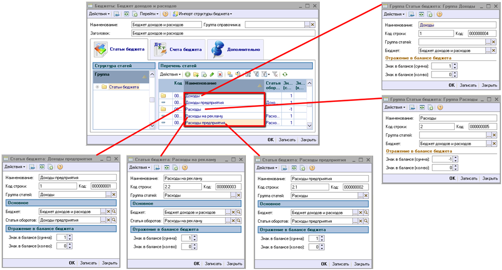 Для определения статей бюджета в информационной базе конфигурации представим их в следующих таблицах: