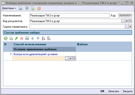 «Состав шаблонов набора» представляет собой набор отдельных шаблонов, входящих в состав схемы отражения фактических данных. Для каждого отдельного шаблона указывается способ его использования в колонке «Способ использования»: