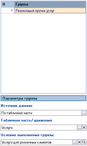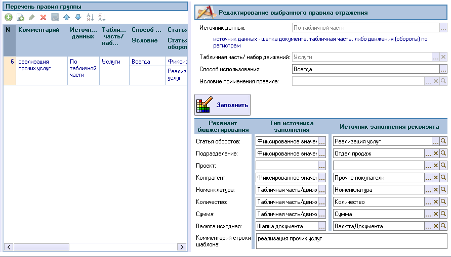 В группе правил добавим правило для шаблона «Реализация прочих услуг» и настроим его параметры.