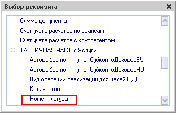 Условие выполнения группы указывается в отдельном окне формы списка справочника «Условия выполнения операций по строкам документа» (меню «Бюджетирование»- «Учет фактических данных»). Настройка данного справочника аналогична справочнику «Условия выполнения операций по документу», за исключением того, что в данной настройке можно указать источник данных, на реквизиты которого налагается условие. Выполнение условия при формировании проводок проверяется для каждой строки табличной части. Назовем условие «Услуги для постоянных клиентов», укажем вид документа «Реализация ТМЗ и услуг», укажем источник данных «По табличной части», для поля «Табличная часть/набор движений» выберем «Услуги» и добавим строку в табличную часть «Составные части условия». Установим параметры для условия. Для поля «Реквизит» по кнопке выбора перейдем в форму «Выбор реквизита». Затем в дереве списка найдем группу «Табличная часть: Услуги» развернем её и выберем поле «Номенклатура»