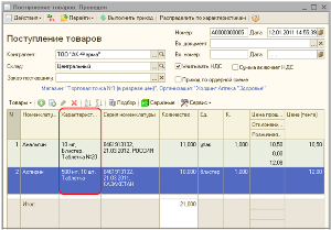 Конфигурация предоставляет возможность хранить информацию о серийном номере, номере и дате сертификата, дате выпуска, сроке годности, производителе и стране происхождения лекарственного средства, то есть вести учет по сериям.