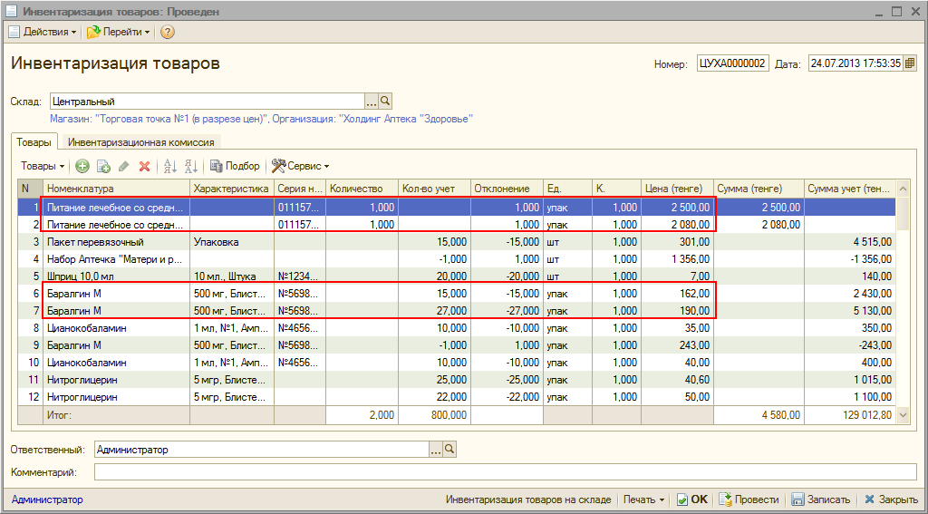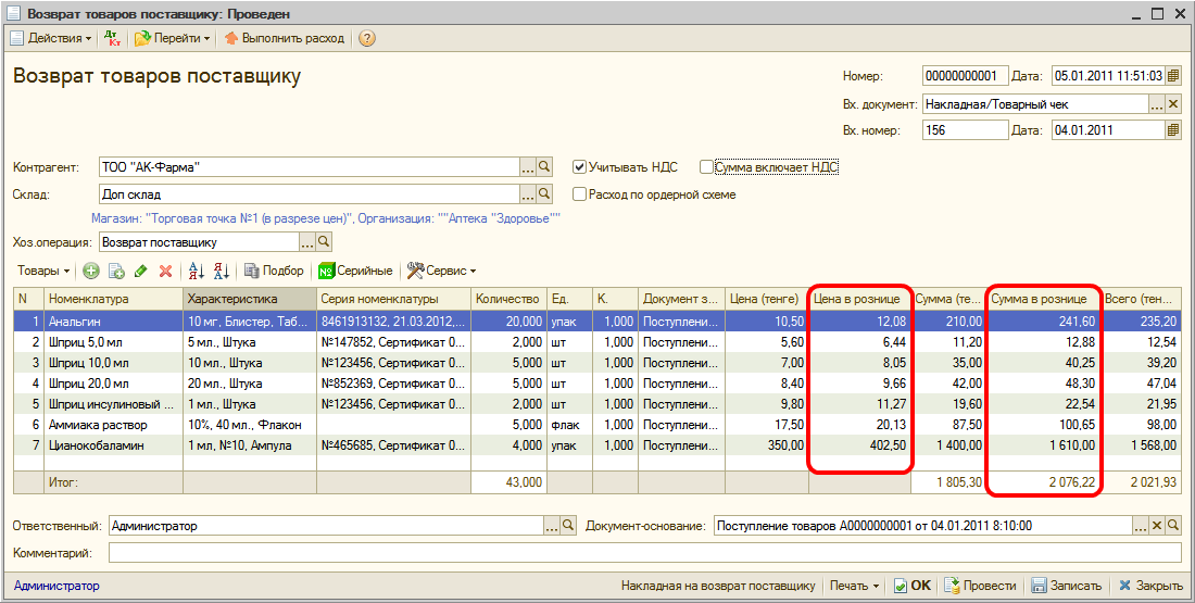 Например, при проведении документа со склада спишется 1 упаковка Цианокобаламина по текущей цене, а приход произойдет в количестве 10 ампул по новой установленной цене.