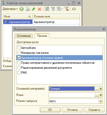 Для организации доступа пользователей к данным предназначена система ролей, которые определяют доступ к объектам конфигурации. После ввода информации о пользователе и его пароле перейдите на закладку «Прочие» и определите для пользователя роль «Администратор (полные права)» и интерфейс «Полный».