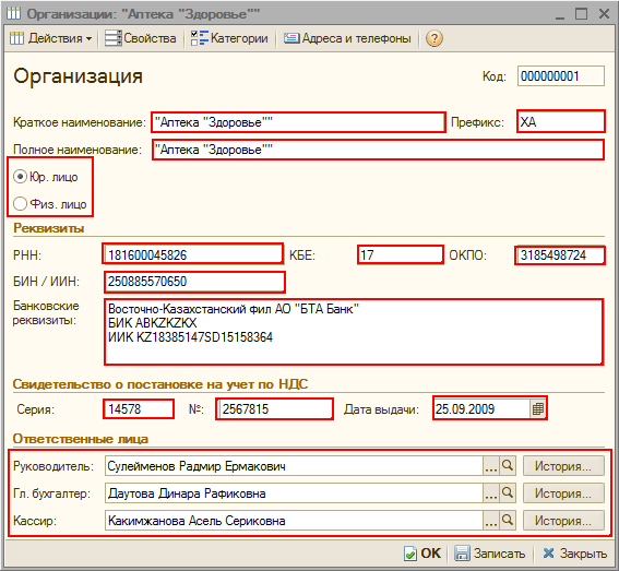 Добавьте информацию об организации, от имени которой будут оформляться все документы в аптеке (меню «Справочники» — «Предприятие» — «Организации»). Реквизиты «Краткое наименование», «Полное наименование» являются обязательными для заполнения. Если учет будет вестись по нескольким организациям, то необходимо в соответствующем реквизите указать префикс для каждой из них. Префикс представляет собой три буквенных символа, которые будут автоматически указываться в начале каждого номера документов организации, тем самым, определяя принадлежность документа той или иной организации. Далее выберите вид организации: юридическое лицо или физическое лицо. Укажите все банковские реквизиты для расчетов — банк, БИК, ИИК; заполните реквизиты в группе «Свидетельство о постановке на учет по НДС» (если организация является плательщиком НДС).