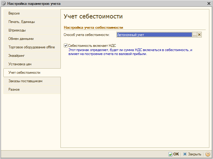 - Флаг «Себестоимость включает НДС» — если флаг установлен, то сумма НДС будет включена в себестоимость.