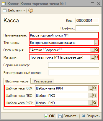 - «Касса центрального офиса» — это касса центрального офиса, в которую будут передаваться денежные средства (выручка) аптеки. При начале работы информацию о таких кассах заполнять не надо.
