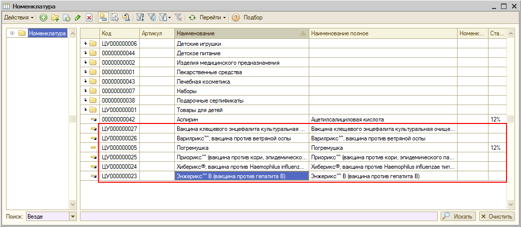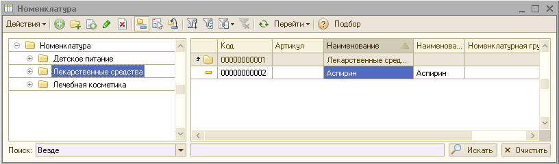 Для добавления номенклатуры из «Государственного реестра лекарственных средств» на форме списка справочника «Номенклатура» предназначена команда «Подбор».