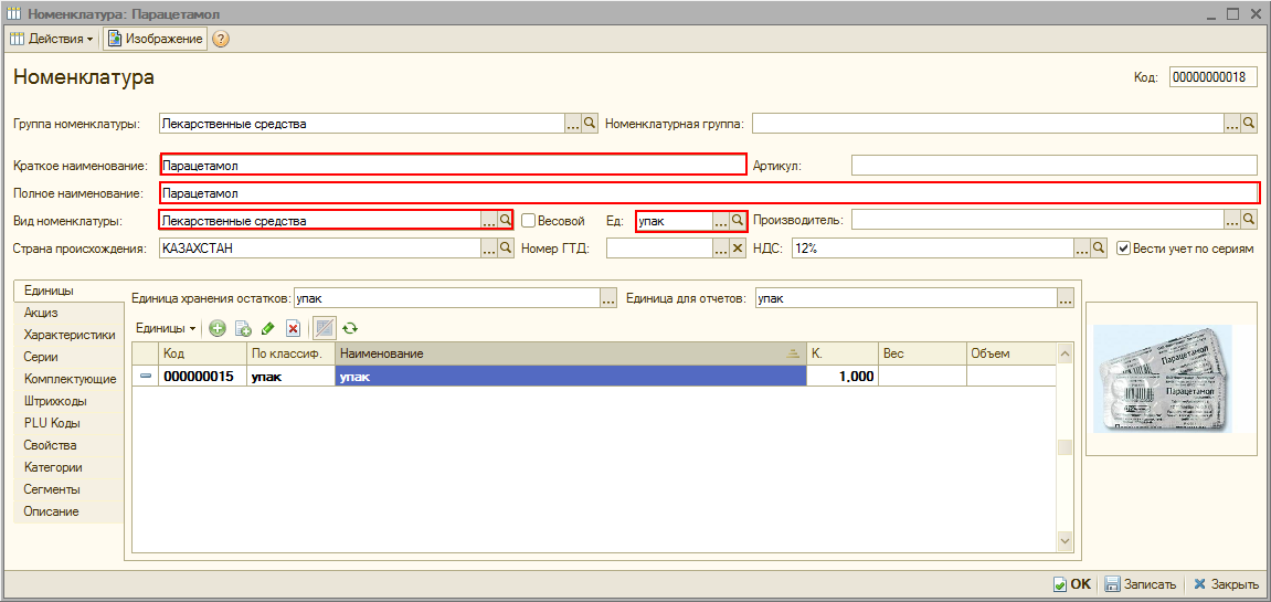 Учет лекарственных средств можно вести в разрезе характеристик. Каждая характеристика содержит информацию по дозировке, фасовке и форме выпуска номенклатуры. Возможность ведения учета лекарственных средств в разрезе характеристик зависит от вида номенклатуры.