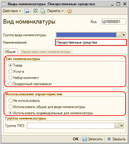 Перед добавлением номенклатуры желательно определить иерархическую структуру номенклатурных позиций (например, «Лекарственные средства», «Изделия медицинского назначения», «Детское питание» и так далее). Для быстрого поиска позиции номенклатуры при подборе товаров в документах используется иерархическая структура. Для создания иерархии заполните реквизит «Группа номенклатуры».