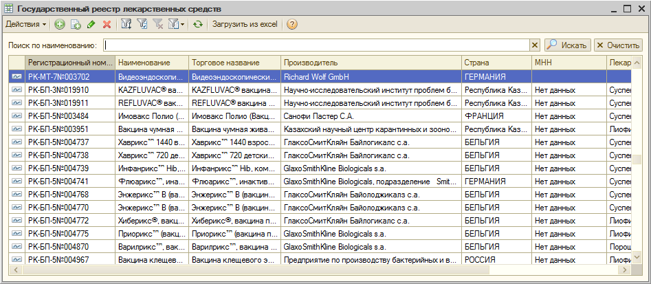 Для того, чтобы заполнить регистр, скачайте актуальный файл с сайта РГП «Национальный центр экспертизы лекарственных средств, изделий медицинского назначения и медицинской техники», воспользуйтесь командой «Загрузить из Excel», укажите путь к скачанному файлу и выберите команду «Открыть».