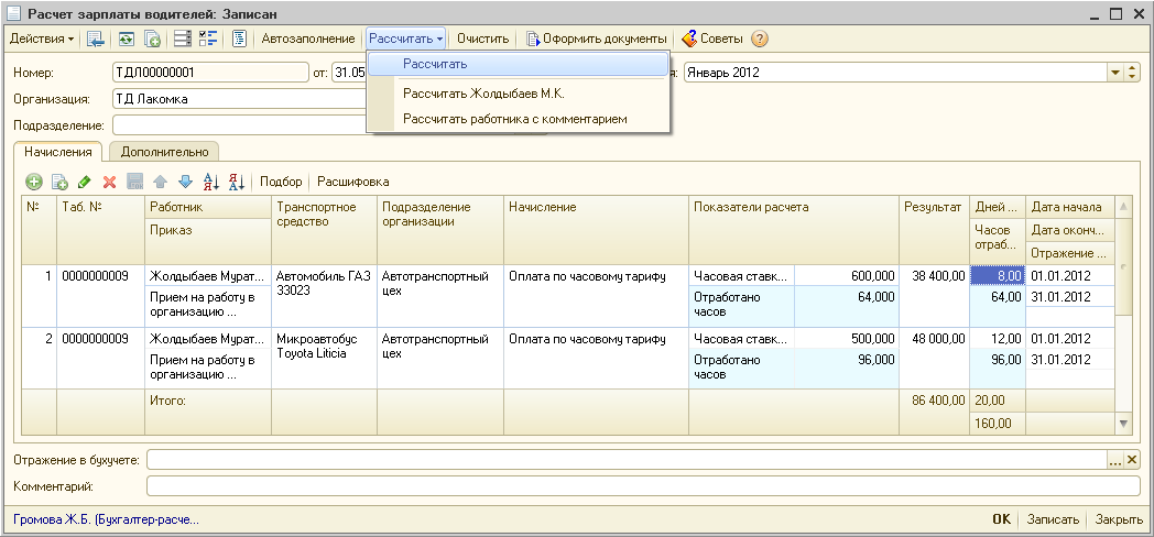 Перезаполним и выполним перерасчет ранее введенного документа «Расчет зарплаты водителей»: